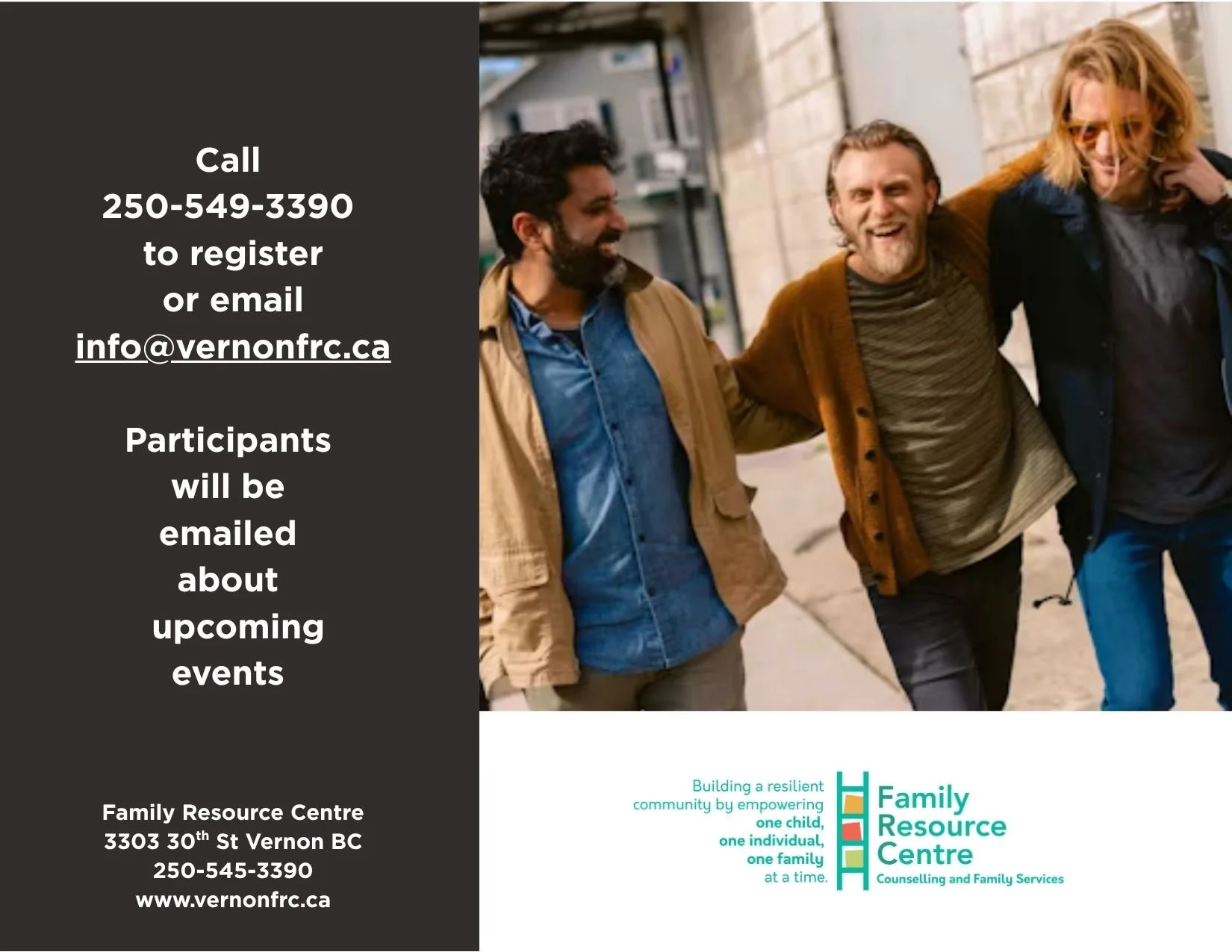 Call 250-545-3390 or email info@vernonfrc.ca to register and get the event schedule.